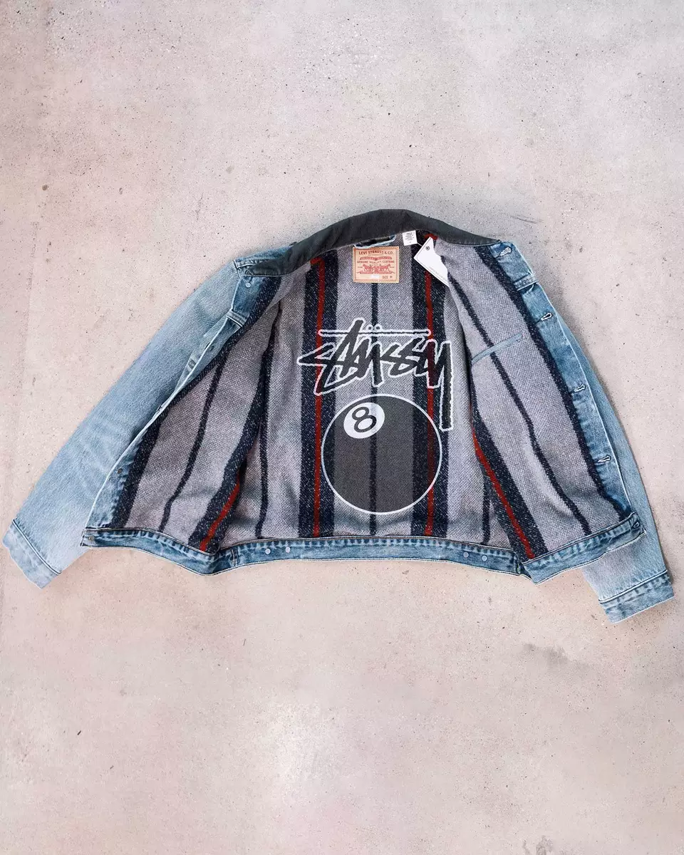 스투시의 고유한 디자인 미학으로 재탄생한 8볼 로고가 인쇄된 안감이 특징인 타입 2 트래커 자켓 그리고 올해 출시 150주년을 맞이한 견고한 인디고 워시가 특징인 501 진으로 구성되어있다.